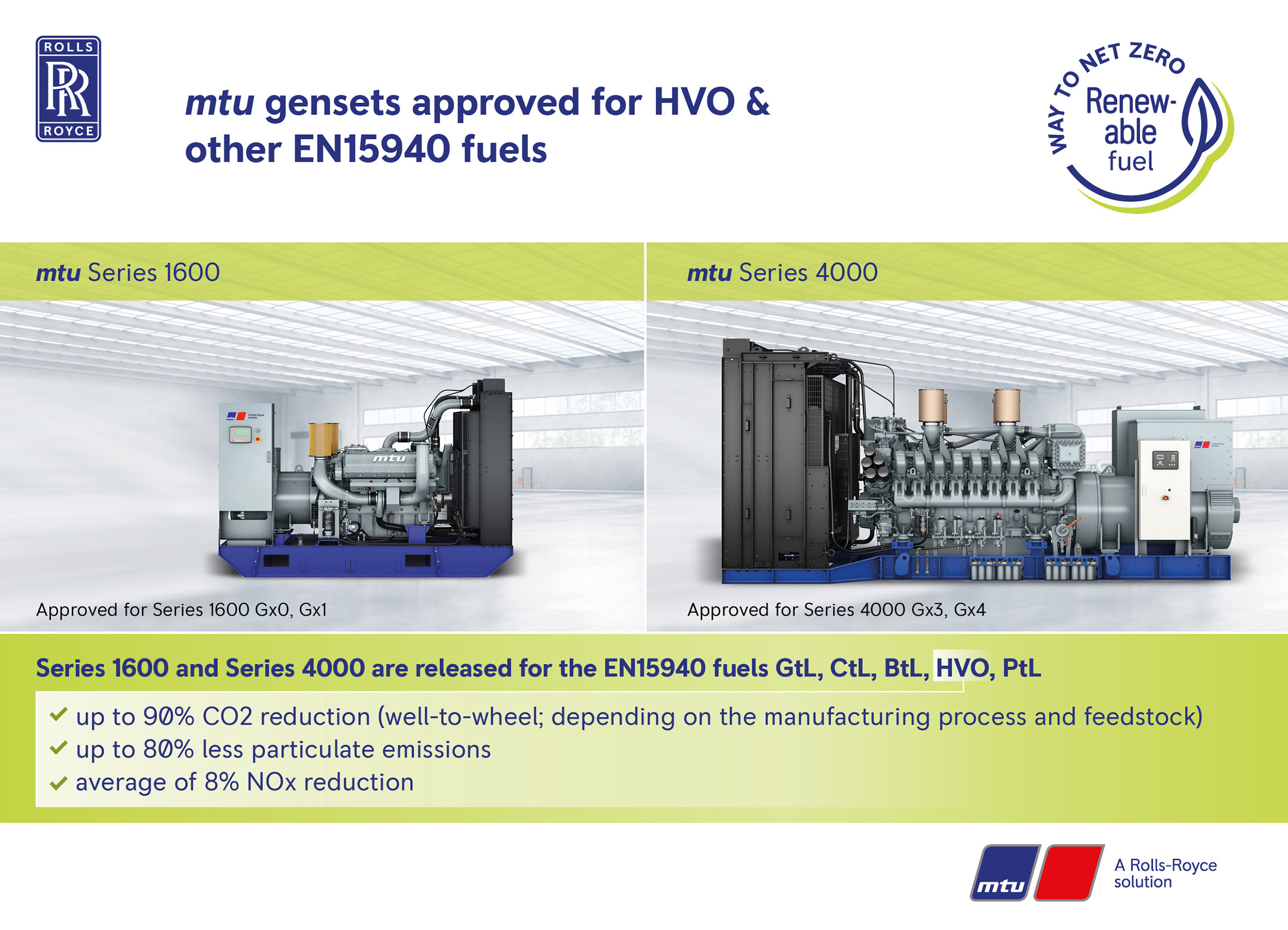 (PRESSEMITTEILUNG) WESTHAMPNETT, UK, 11-May-2022 — /EuropaWire/ — Rolls-Royce (LSE:RR., ADR:RYCEY), Das herausragende Engineering-Unternehmen mit Schwerpunkt auf Weltklasse-Kraft- und Antriebssystemen hat bekannt gegeben, dass seine Dieselmotoren der Serien 4000 und 1600 von Power Systems, der Geschäftseinheit des Unternehmens, für die Verwendung mit einer Reihe von EN15940-zertifizierten synthetischen Motoren zugelassen wurden Dieselkraftstoffe in Stromerzeugungsanwendungen. Die Zulassung folgt auf erfolgreiche Tests, auch im Feld, und beide Motortypen können eine Reihe nachhaltiger Kraftstoffe verwenden, darunter Biomass-to-Liquid (BtL), mit Wasserstoff behandeltes Pflanzenöl (HVO) und Power-to-Liquid (PtL)-Kraftstoffe wie E-Diesel . Sie alle können herkömmlichen Dieselkraftstoff ersetzen.