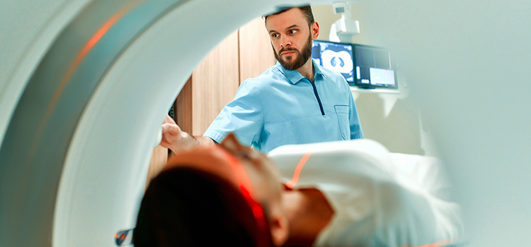 Eine Patientin, die auf CT oder MRI liegt, das Bett bewegt sich in der Maschine und scannt ihren Körper und ihr Gehirn unter der Aufsicht eines Arztes und eines Radiologen. In einem medizinischen Labor mit Hightech-Ausstattung.