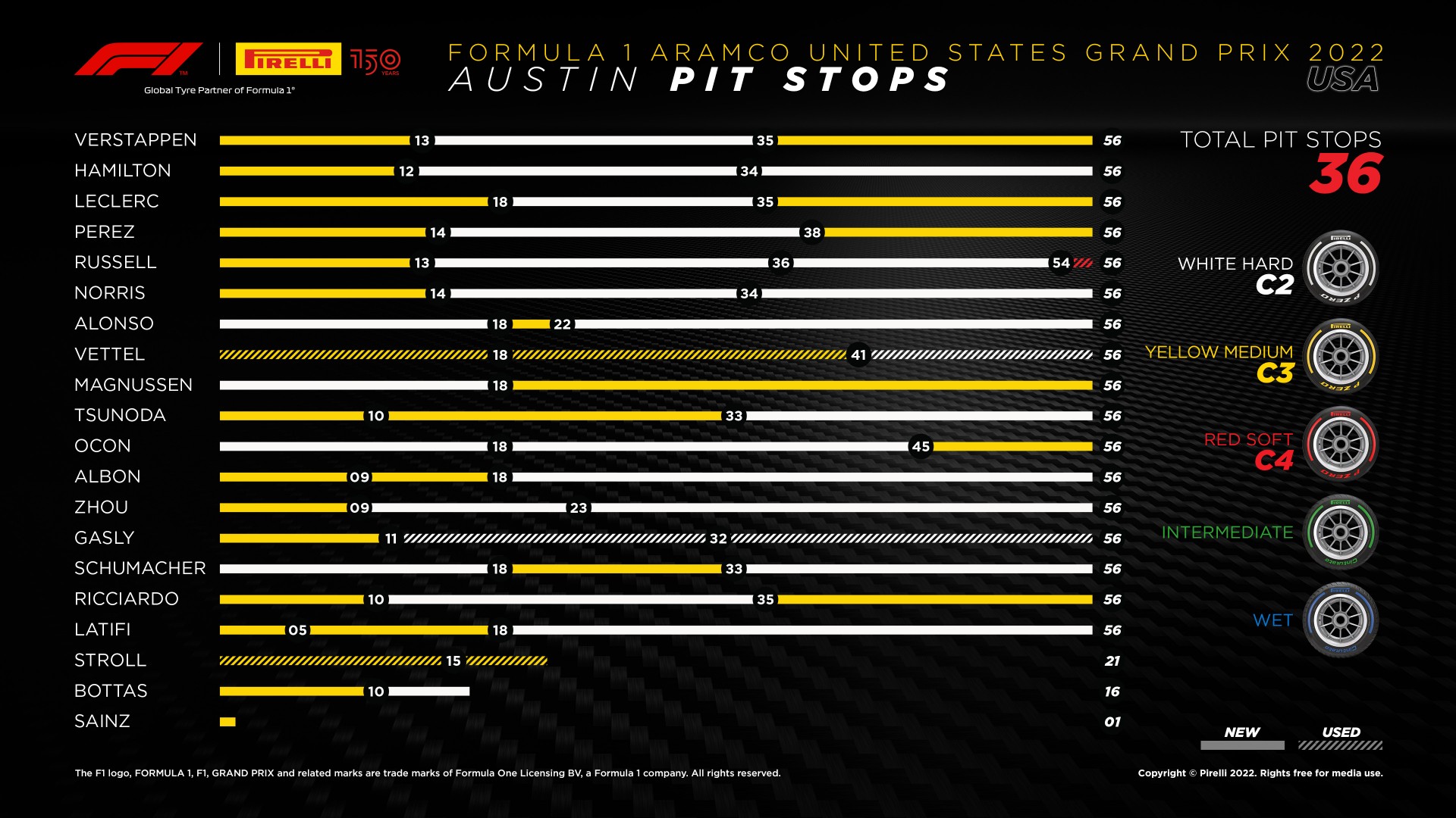Max Verstappen von Red Bull übernahm in der ersten Kurve die Führung, nachdem er auf dem P Zero Yellow Medium-Reifen gestartet war – die gleiche Wahl, die von 16 der 20 Starter getroffen wurde. Verstappen fuhr von der Spitze aus für P Zero White harte Reifen an die Box und tauchte dann wieder an der Spitze auf, kurz nachdem Hamilton einen ähnlichen Stopp eingelegt hatte. Nachdem er zwei Safety-Car-Neustarts mit intaktem Vorteil überstanden hatte, legte Verstappen 20 Runden vor Schluss seinen zweiten Stopp für einen weiteren Satz mittlerer Reifen ein und fiel nach einem Problem an der Box hinter Hamilton zurück – auf dem harten Reifen für den letzten Stint. Verstappen jagte den Mercedes-Fahrer und gewann das Rennen schließlich mit vier Sekunden Vorsprung, nachdem er seine Reifen perfekt verwaltet und den Konstrukteurstitel 2022 für Red Bull besiegelt hatte.