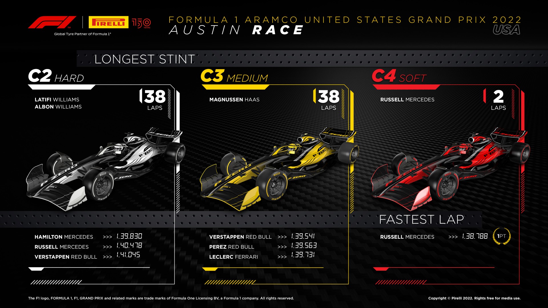 „Da Max Verstappen das Rennen gewonnen hat und sein Team eine weitere Konstrukteurs-Weltmeisterschaft gewonnen hat, sprechen wir Red Bull Racing unsere Glückwünsche aus, natürlich zusammen mit unserem Beileid für den traurigen Tod von Dietrich Mateschitz. Das Rennen heute war intensiv, unterbrochen von zwei Safety-Cars, die dazu beitrugen, den Reifenverschleiß zu reduzieren – der bei diesen warmen Bedingungen dennoch geringer war als erwartet. Die Strategie erwies sich erneut als äußerst wichtig, da Lewis Hamilton versuchte, Verstappen zu unterbieten, und das Rennen zu einem atemberaubenden Duell zwischen ihnen führte. Zuvor haben wir auch einen großartigen Kampf zwischen Verstappen und Charles Leclerc von Ferrari gesehen. Die beiden Fahrer auf unterschiedlichen Compounds während des letzten Stints waren ein echter Hingucker für das riesige amerikanische Publikum; Rund 440.000 Menschen erlebten einen spannenden Kampf bis zum Schluss. Beide Fahrer haben alles gegeben, aber ihre Reifen waren dem Kampf gewachsen“, kommentierte Mario Isola – Motorsport Director.
