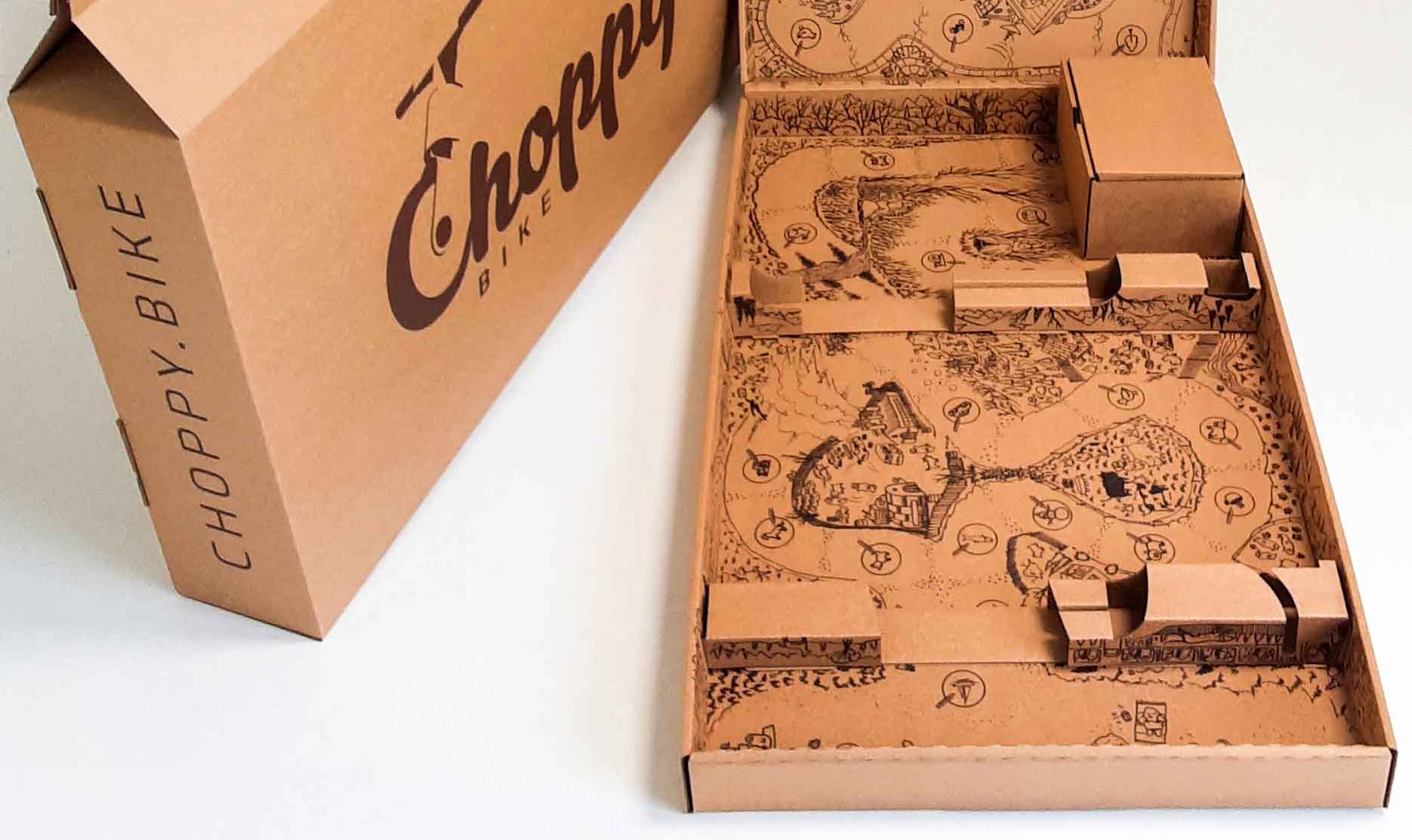 Grinbergs und Blicsons wollten, dass das Paket wertvoll bleibt, auch nachdem das Choppy Bike entfernt und zusammengebaut wurde. Wenn Sie die Schachtel öffnen, wird ein Spiel enthüllt. Das STUM-Team ließ einen Künstler eine detaillierte Straße zeichnen, die sich durch viele Abenteuer windet und windet, bevor sie schließlich an einem Strand endet.
