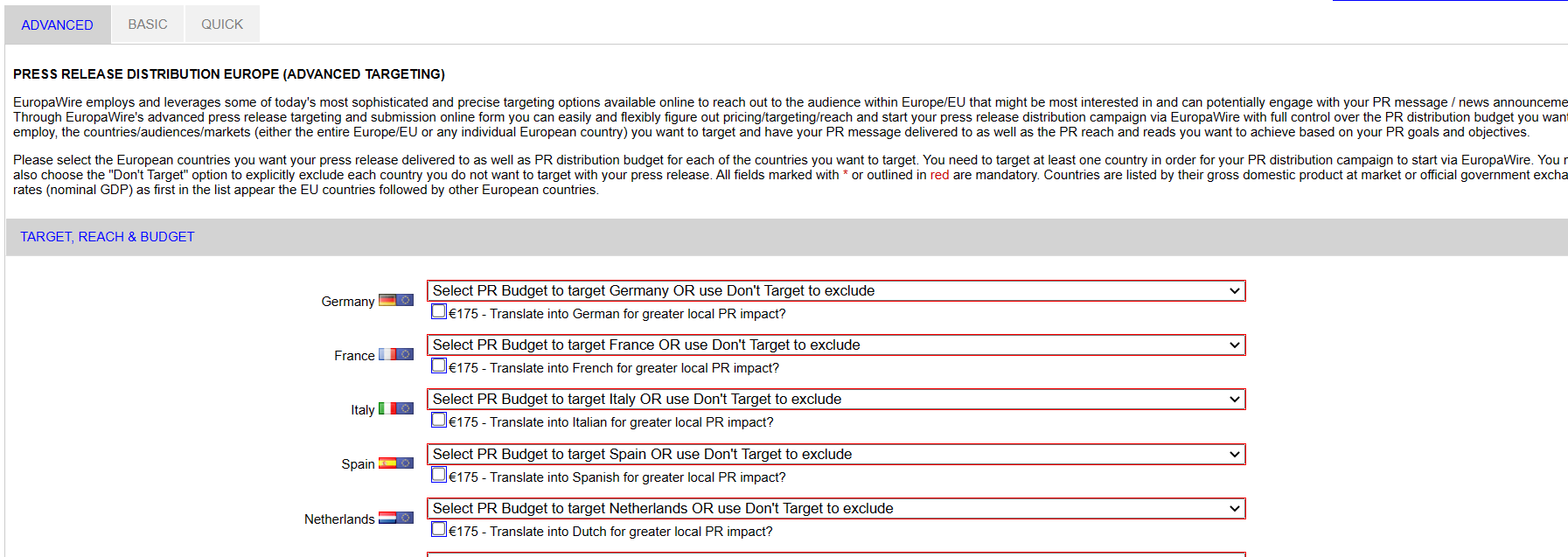 Der einfachste Weg, Preisgestaltung, Zielgruppen, Reichweite und Leserkontakte zu ermitteln und Ihre PR-Kampagne mit voller Kontrolle über Budget, Zielländer und Zielmärkte zu starten, ist unser erweitertes Online-Formular für PR-Targeting und Einreichung.